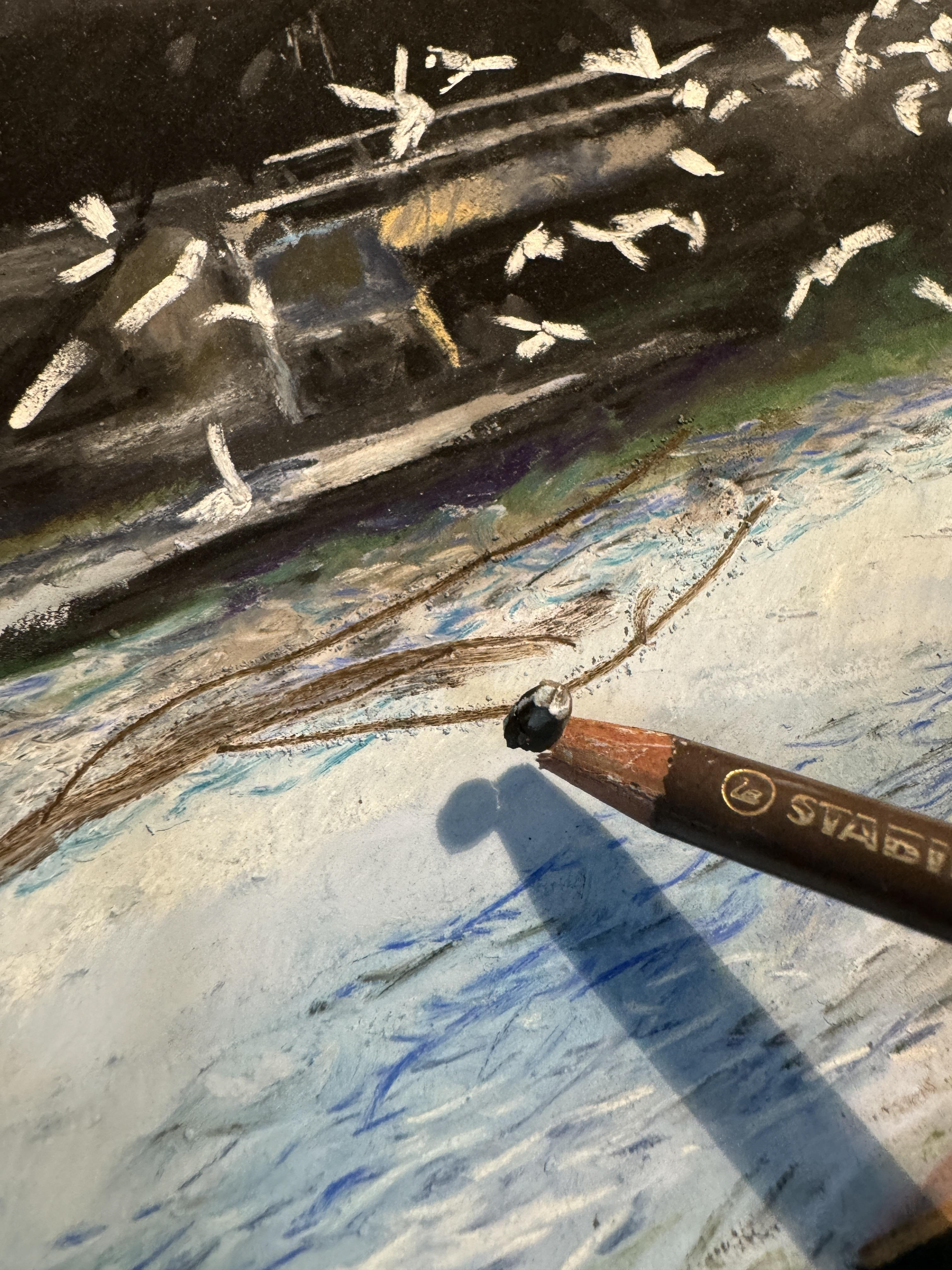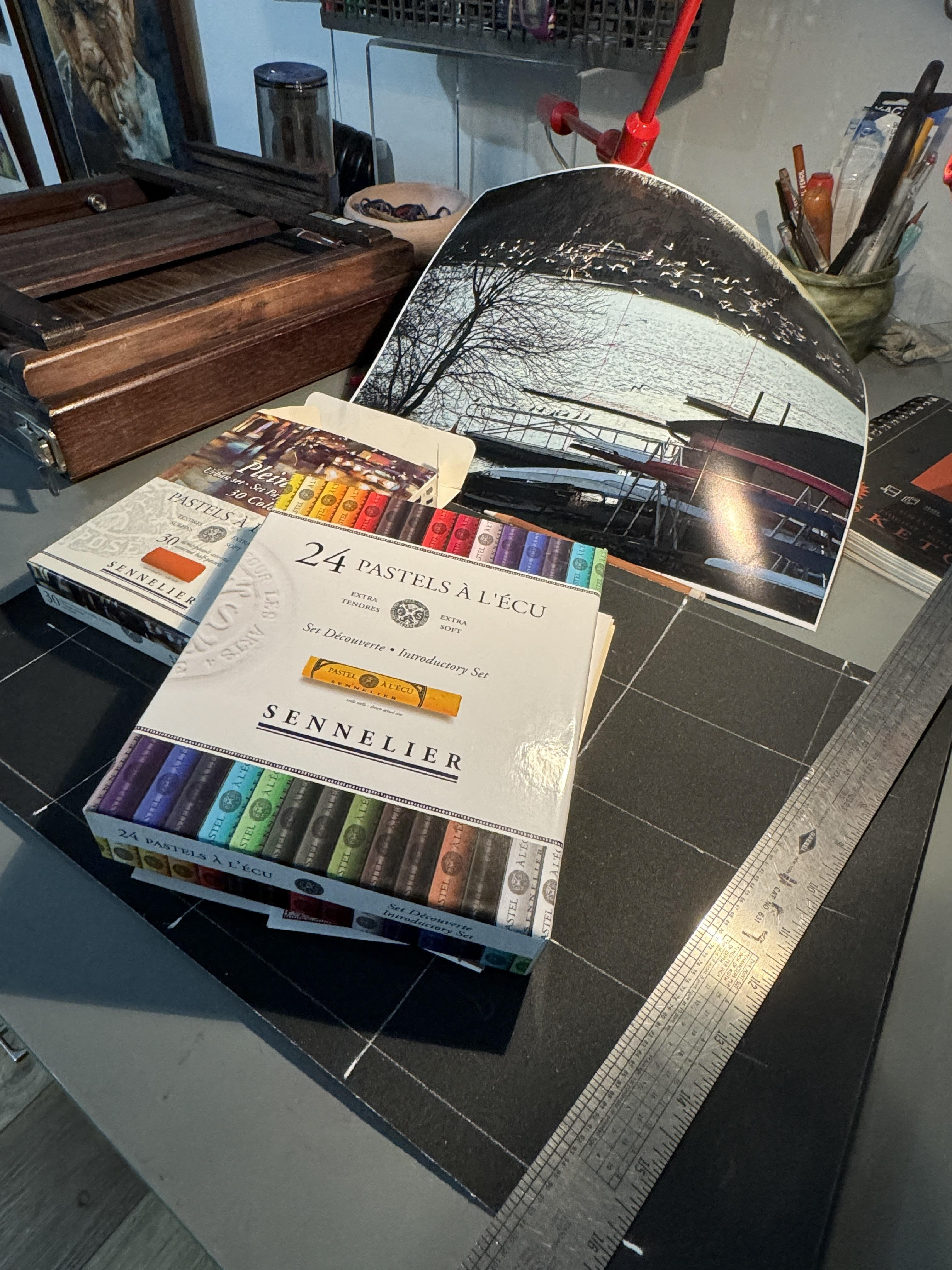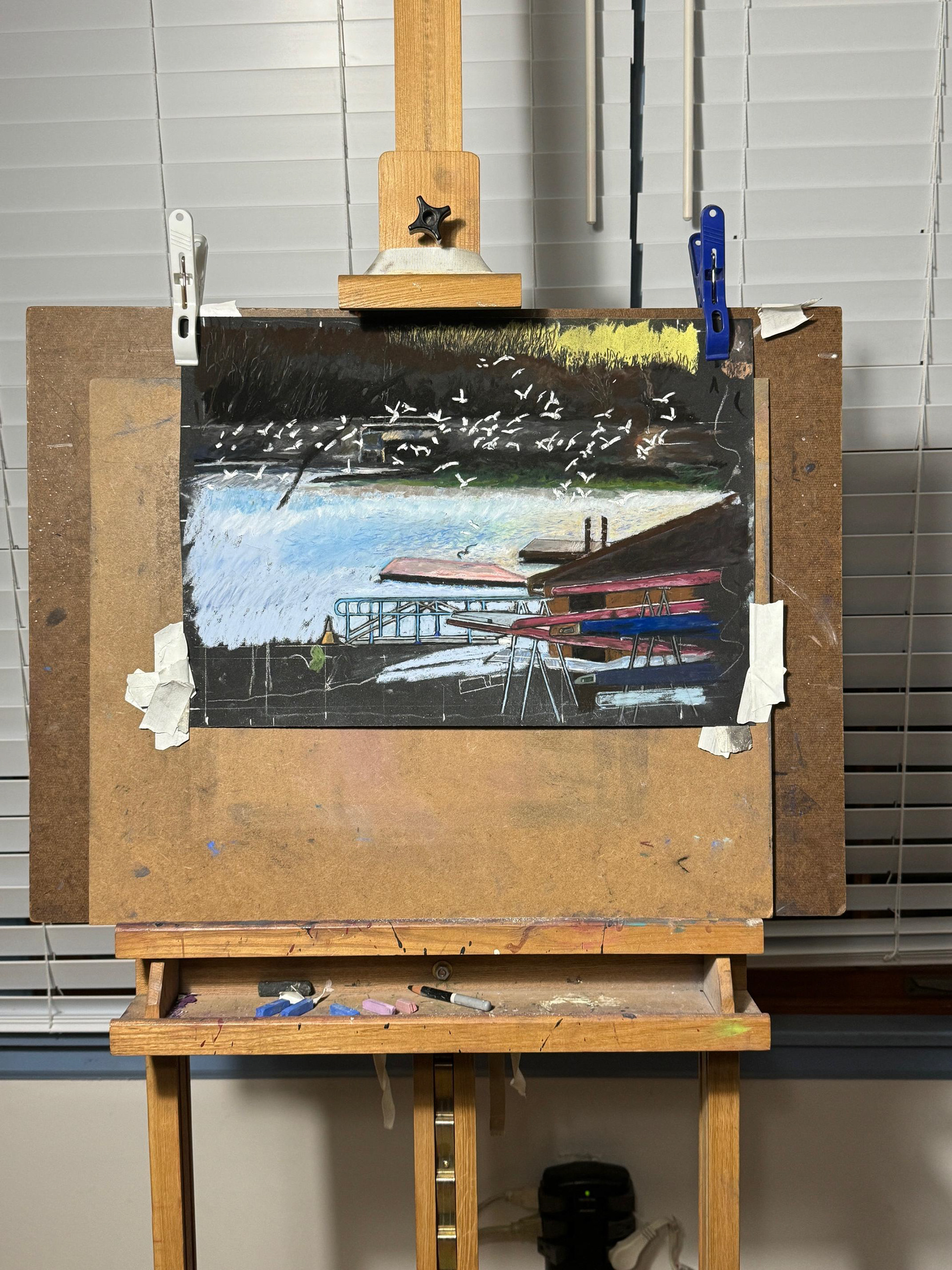 I used a brand new, professional set of pastels flown all the way back from Paris - thank you hubby - and chose to paint this serenity scene which I photographed at Bucks County Park's Lake Luxembourg in Langhorne, PA. I needed to illustrate a sense of comfort and healing for me.