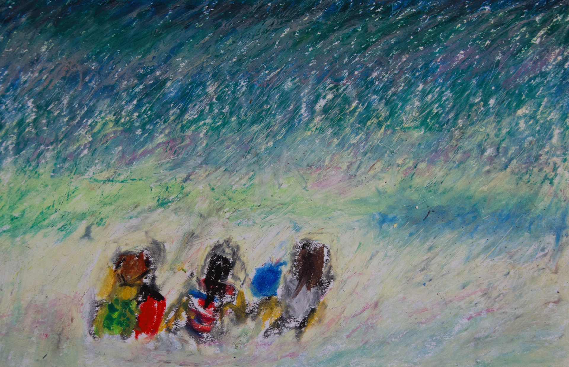 Done in oil pastels, while sitting on the beach in Wildwood, New Jersey, I had to quickly capture these three children who were just so wildly in love with the sand and the water.