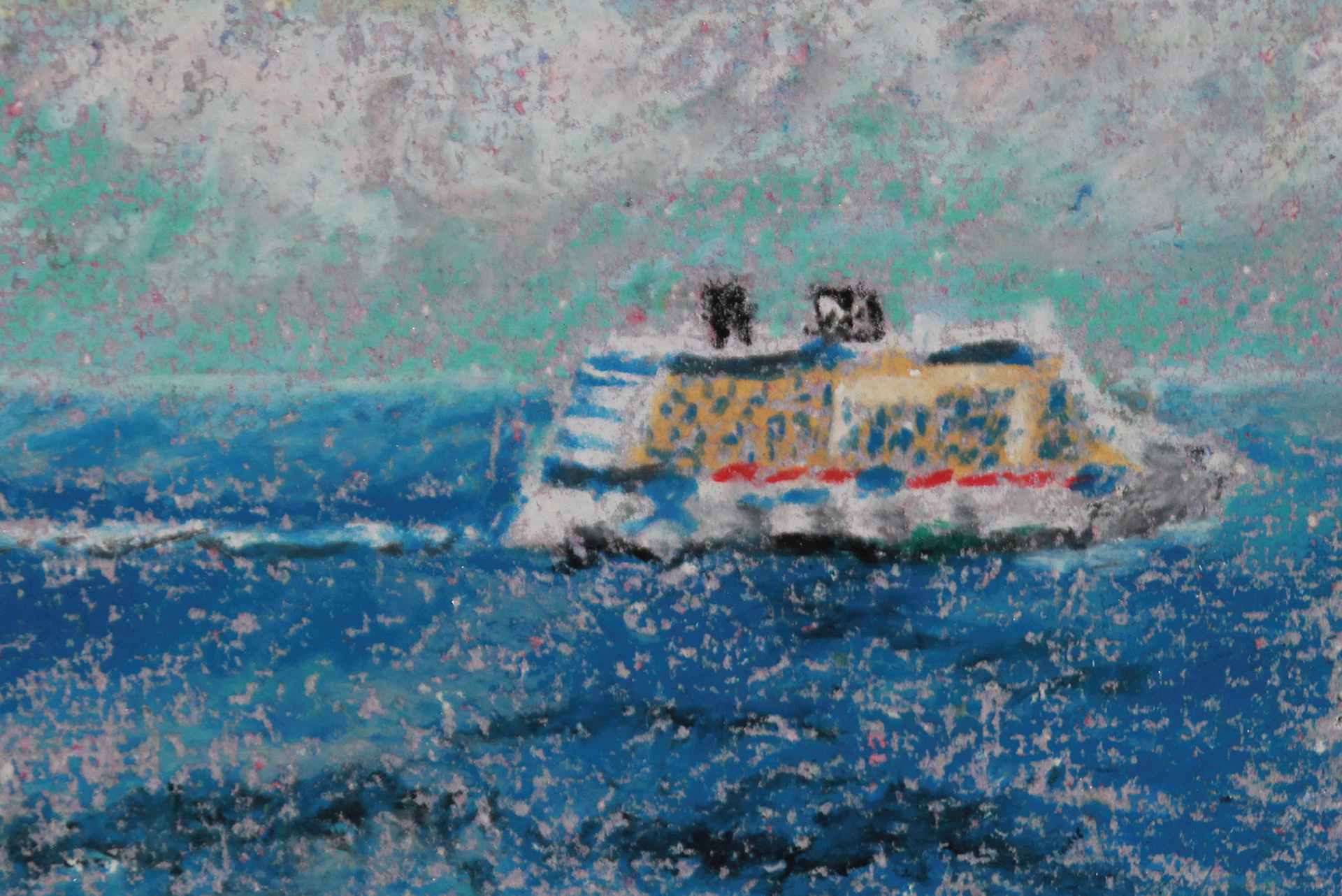 Laying on a comfy lounge chair, seeing passed my toes and through the glass fence in front of me, I had time to get a good rendering of another (passing) cruise ship.