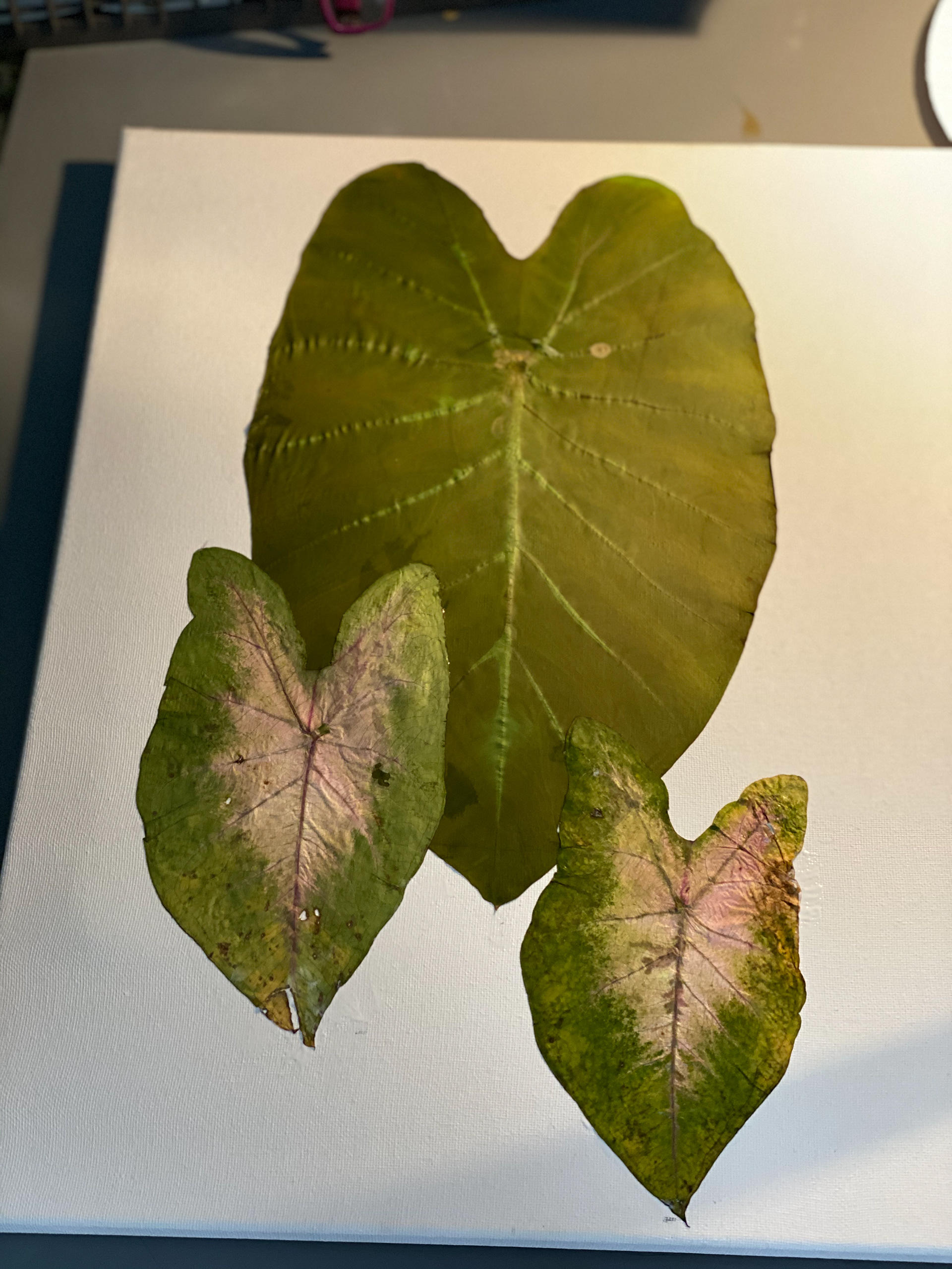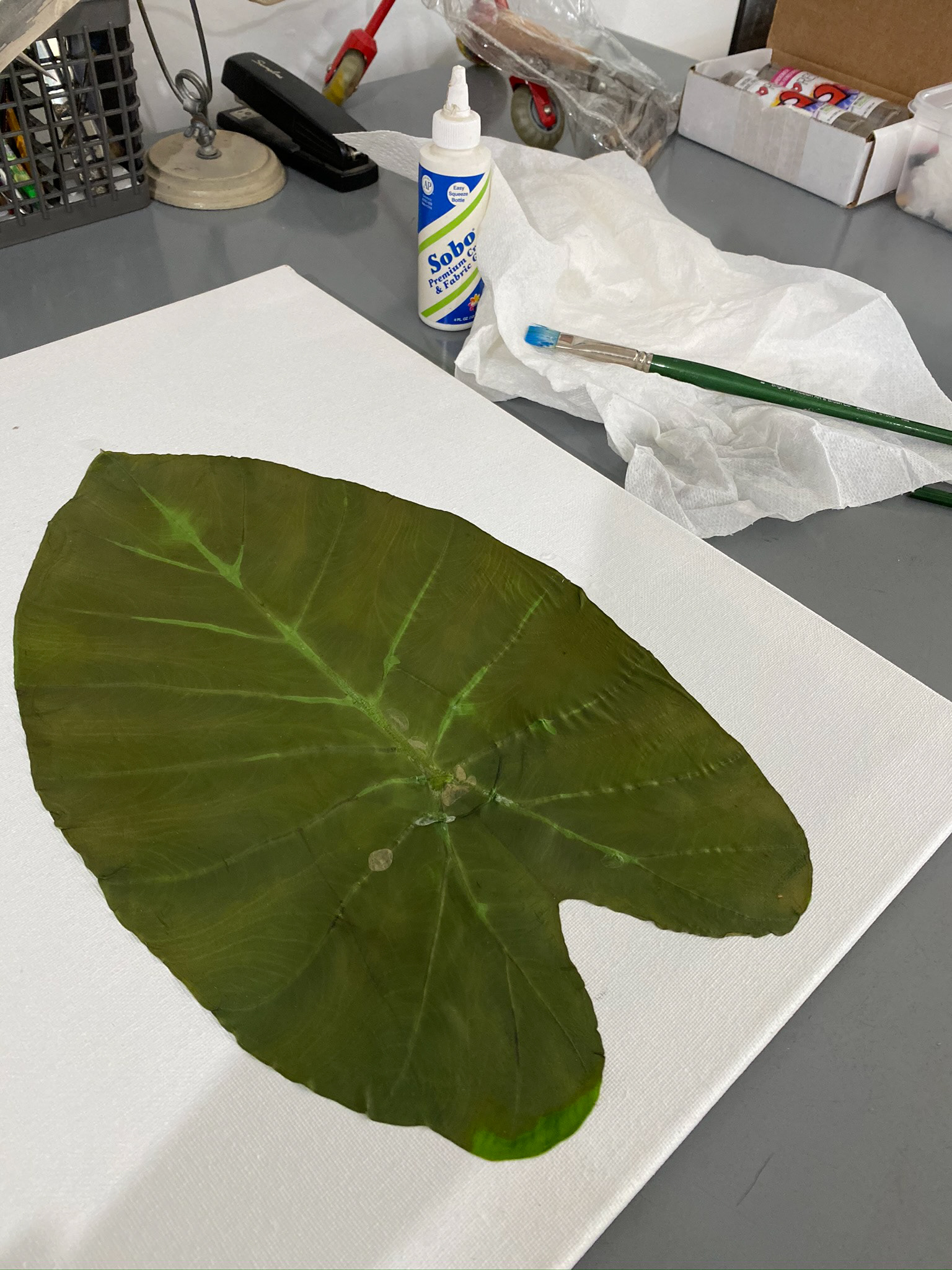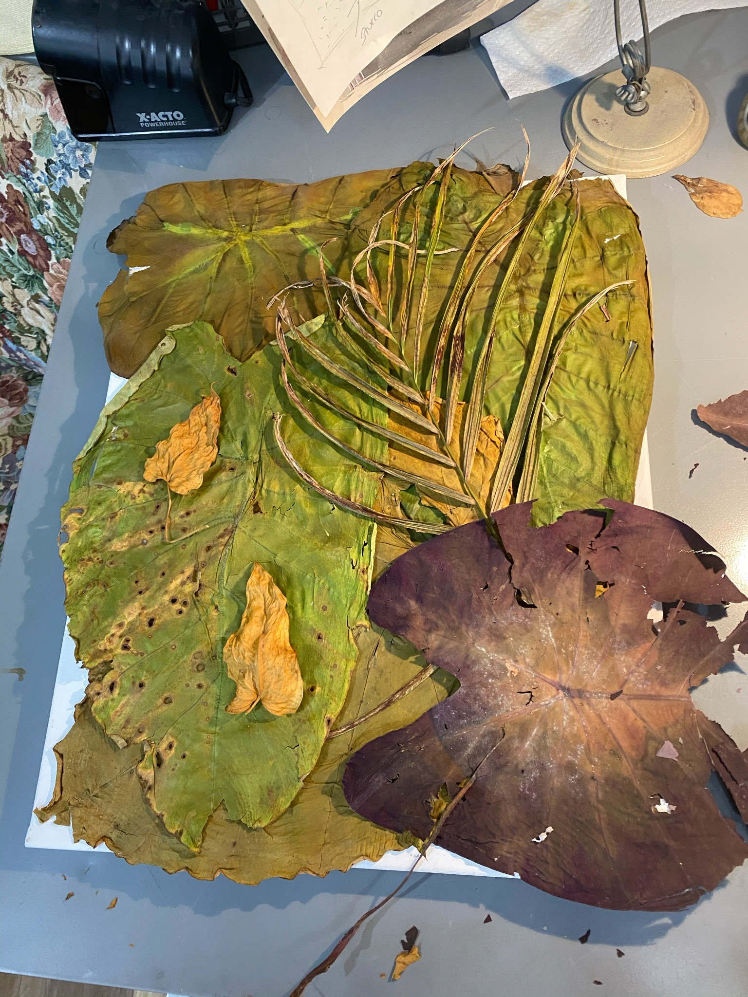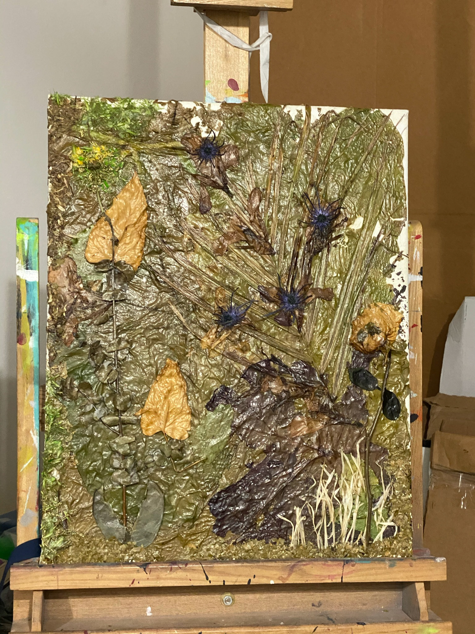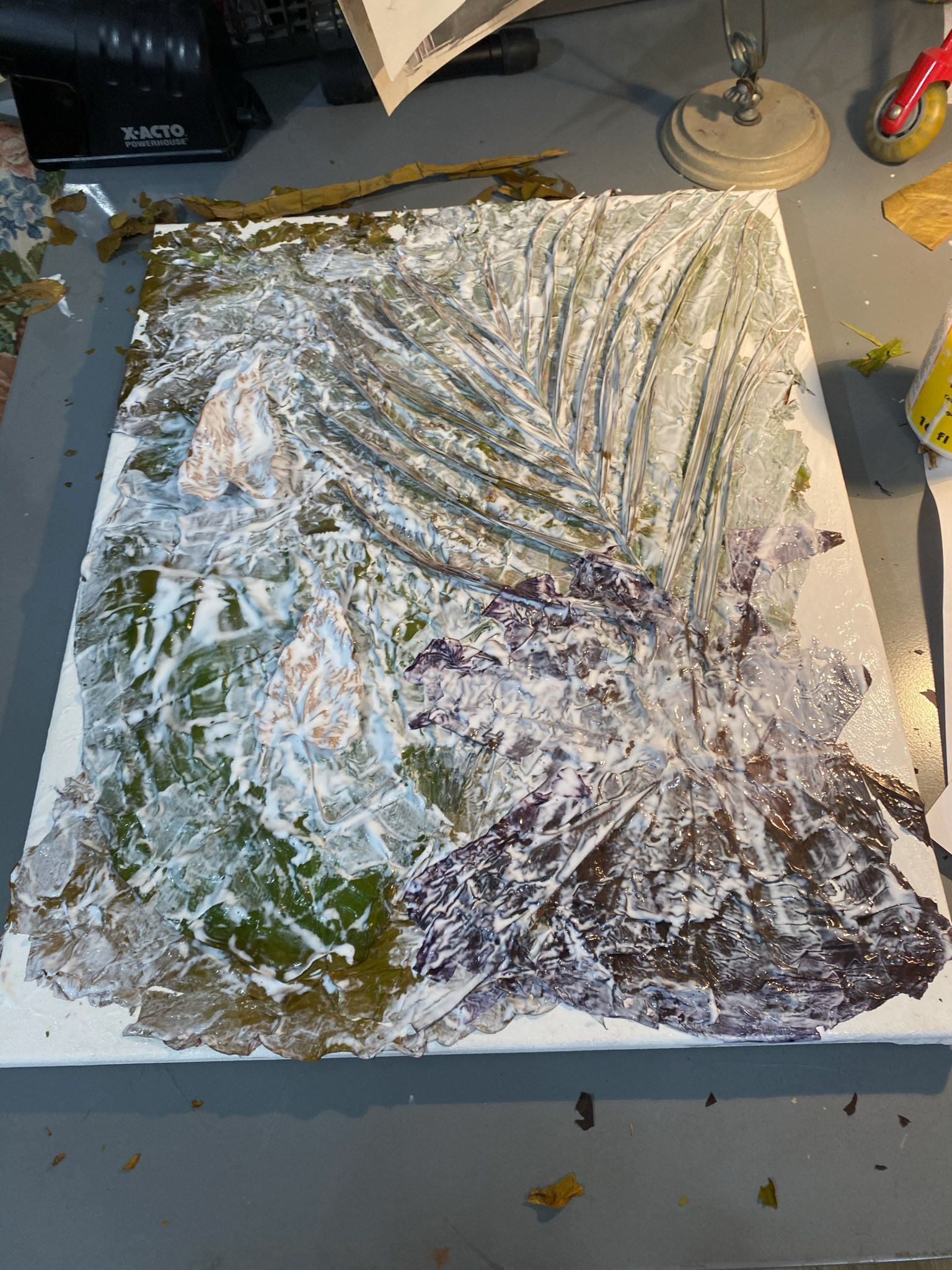 16 x 20 canvas of collected backyard clippings applied with Mod Podge (a decoupage medium - all in one glue, sealer and finish).